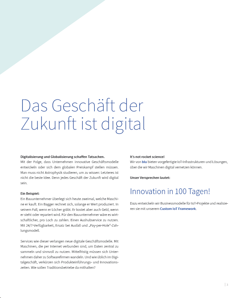 Wir von blu bieten vorgefertigte IoT-Infrastrukturen und Lösungen, über die wir Maschinen digital vernetzen können. Unser Versprechen lautet: